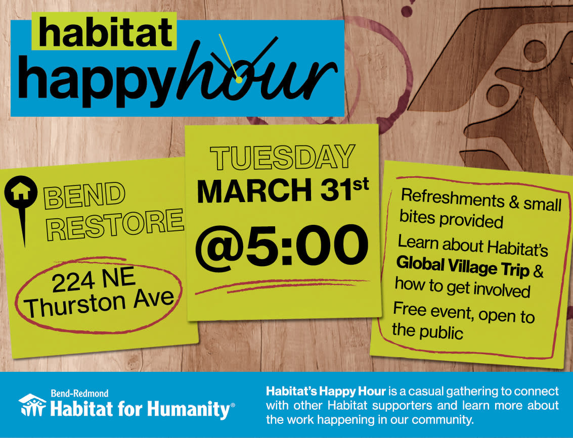 Join us at the Bend ReStore for Happy Hour! We will be talking about the opportunity to travel to Guatemala for a service project we call Global Village. There will be a panel discussion where former trip participants share their experience, and we will give more details about the trip for anyone who is interested in joining this year! We will have appetizers, beer and wine.
